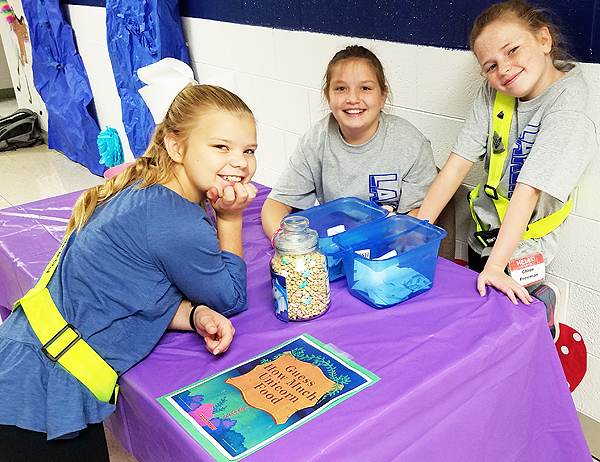Fifth graders Kaylynn Seiber, Coy Tomlinson, and Chloe Freeman collecting donations and unicorn food guesses.