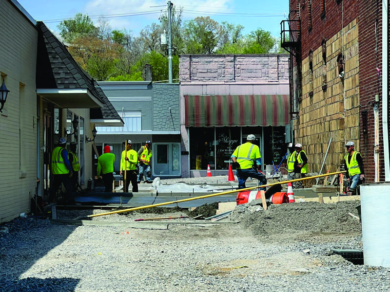 Work continues this week on the concrete paving of Pearl Alley in downtown Clinton, a convenient walkway between the Commerce Street parking lot and the businesses on Market Street. Additionally, Main Street remains closed to traffic from Broad to Kincaid streets as workers continue laying lateral sewer lines from Main Street buildings to the new main sewer line running down the middle of the street. Clinton City Manager Roger Houck said last week that the Market Street project “is about 80 to 82% complete, so it’s getting there. The trees will be pretty good size – they won’t be saplings. Planting will be done after the concrete work is done.” Pearl Alley paving began early last week, and was about two-thirds finished by Monday, with the last part to be completed the section on the south end, connecting to the sidewalk on Commerce Street. Meanwhile, pouring of concrete for the new sidewalks on Market Street is nearly finished, but the planters and a few other elements remain to be completed, including irrigation, installation of light posts, and planting of trees and shrubs.