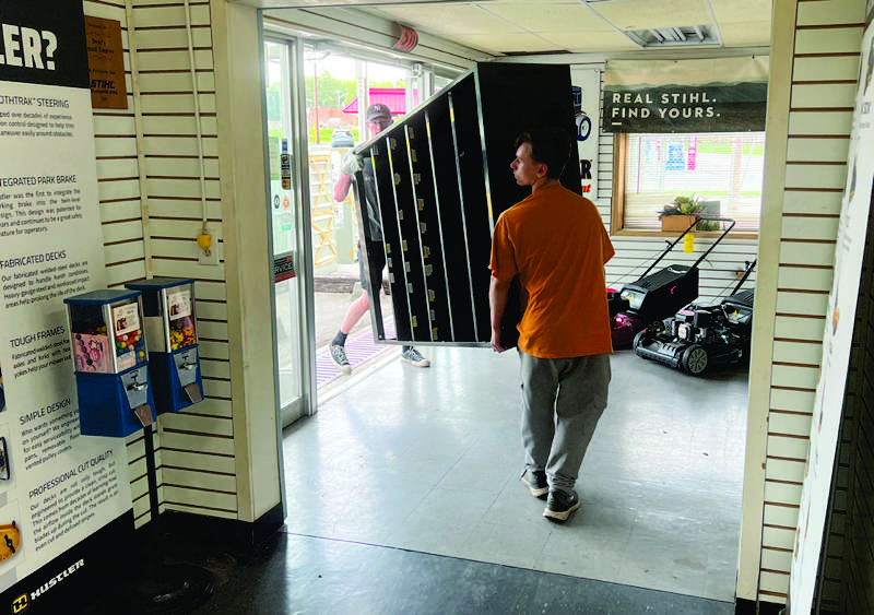 Micah Piotrowicz and Justice Snyder move a shelf from the Deal’s Small Engine store on North Main Street on Monday. The store closed last Friday. (photo:G. Chambers Williams III )