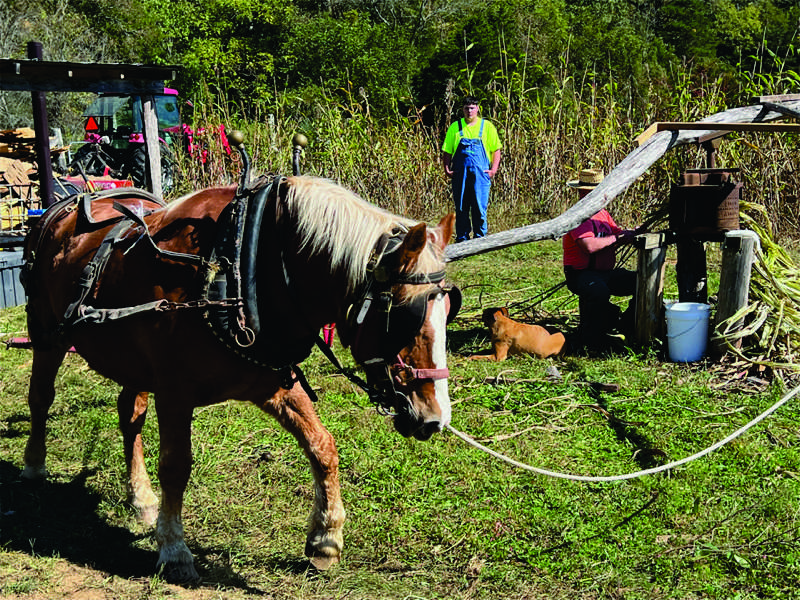 The operation ramped up for the first time this season this past weekend as draft horse Ethel was out in the field turning the mill for the sorghum cane grown on the farm, at 514 Park Lane.