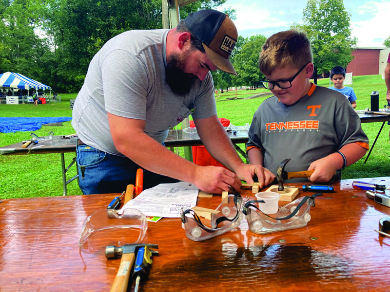Jeff Foust and Jackson Foust work on a project at the Home Depot tent at the Atomic Fall Fest in Oak Ridge. - Ben Pounds