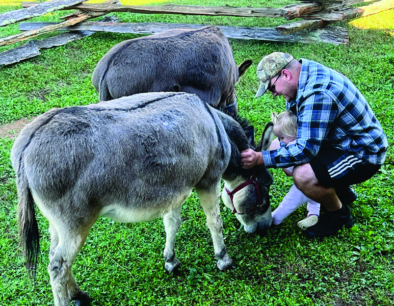 John VandenHeuvel and daughter Hadley, 16 months, make friends with donkeys Frisco, in front, and Anton at the Museum of Appalachia during last Friday’s Donuts with Donkeys event. - G. Chambers Williams III