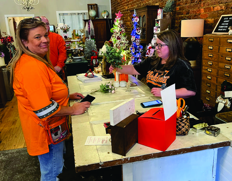 Tracy Rose of Hardin Valley, left, makes a purchase in the Dandelion Market during last November’s Christmas Open House on Market Street in downtown Clinton, assisted by store owner Charity Helton. (photo:G. Chambers Williams III )