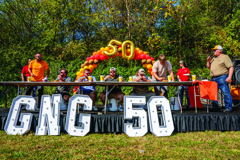 Andrew Smiddy, Mike Farley, Kris Hicks, Kevin Powers, Seth Carroll and Gabriel Sanders participate in the Git’N Go Hot Dog Eating Contest on Saturday as part of the 50th-anniversary celebration. Kevin Powers, dean of students at Clinton Middle School, won the contest by eating 7-1/2 “all the way” hot dogs in three minutes. - Tony Cox