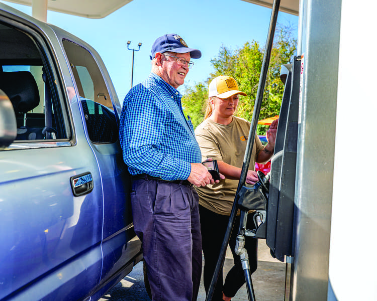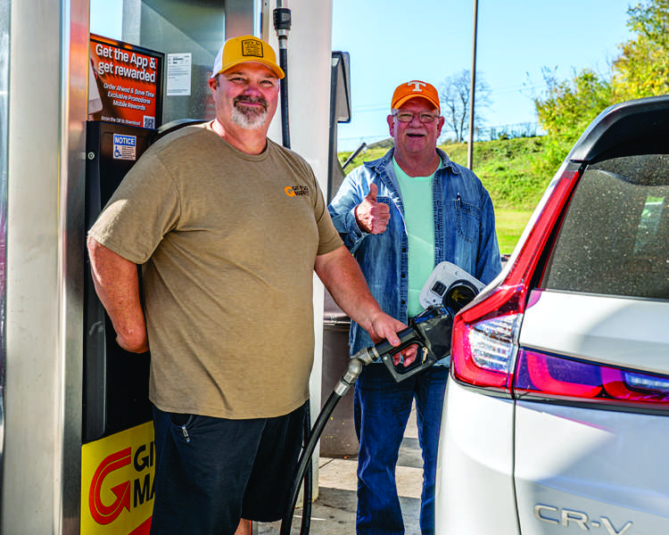 Mitch Waters gives a thumbs up to his former employer, Joe Hollingsworth Jr., during Thursday’s Git Pumped event. Waters was on his second trip to the store to take advantage of the 30-cents-per-gallon savings while the event was taking place. - Tony Cox
