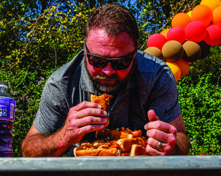 Local attorney and city judge Mike Farley takes a quick breather during the Git’N Go Hot Dog Eating Contest on Saturday. - Tony Cox