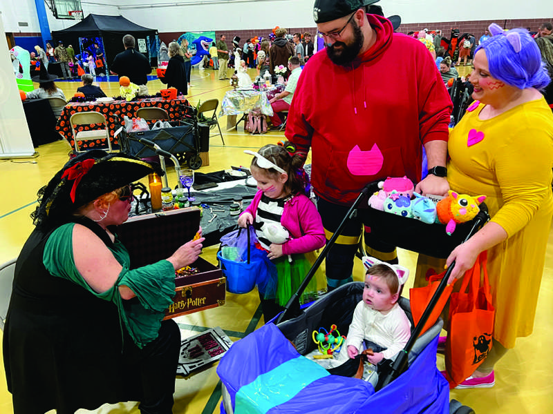 Clinton Library Director Miria Webb greets Lillian Nibbe, 4, during Sunday’s Halloween party at the Clinton Community Center. Looking on are mom and dad, Russell and Ashley Nibbe, and brother Xander, 8 months.