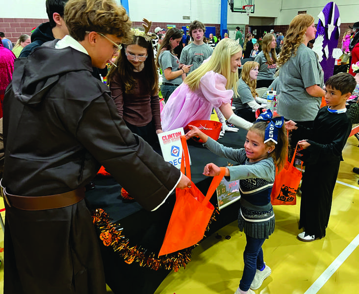 Clinton High School DECA members hand out candy during Sunday’s Halloween party at the Clinton Community Center. The DECA students are, from left, Graycen Crowley, Ellie Bonesteel and Kennedy Cook.