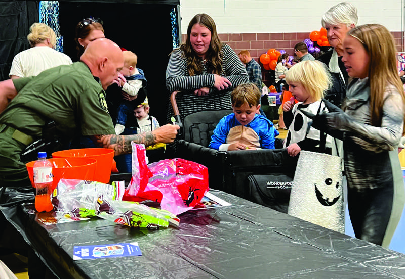 Greg McBroom of the Anderson County Sheriff’s Office hands out candy during the Clinton Trick or Treat party last week at the Community Center. - G. Chambers Williams III