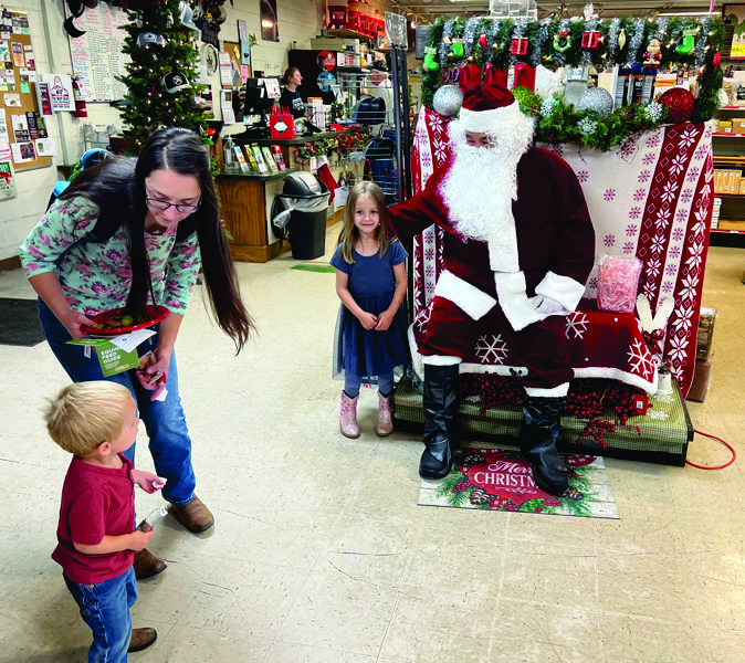 Two-year-old Carson Walker can’t decide whether he wants to get any closer to Santa on Saturday during the Farmers Co-op’s Christmas Open House, as mom Damaris encourages him. Sister Jasmine, 5, wasn’t so shy. (photo:G. Chambers Williams III )