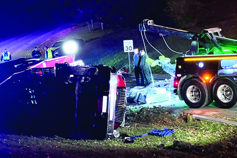 According to emergency personnel at the scene, the truck was responding to a traffic accident on Norris freeway around 8:30 when its right-side wheels slipped off the pavement on West Norris Road, causing the truck to roll over when the driver brought it back onto the road.