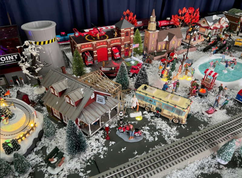 The layout includes colorful, lighted, active pieces such as amusement park rides, a fire station, Disney-style attractions, a Lionel model-train store with tiny trains running around on tiny tables, and much more.