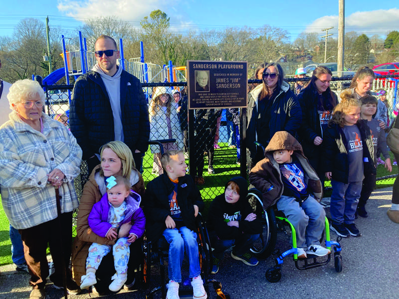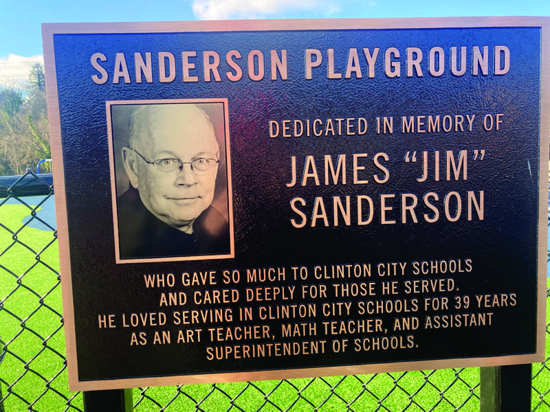 A sign outside Clinton Elementary School’s new playground honors the legacy of James Sanderson, who served Clinton City Schools for 39 years as an art teacher, math teacher and assistant superintendent.
