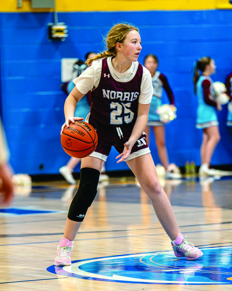 Norris’ Sadie Housley brings the ball up the court during the Lady Senators’ Thursday night game against Jefferson. Norris Middle School defeated Jefferson 37-18 to remain in first place in the district. (photo:Tony Cox )
