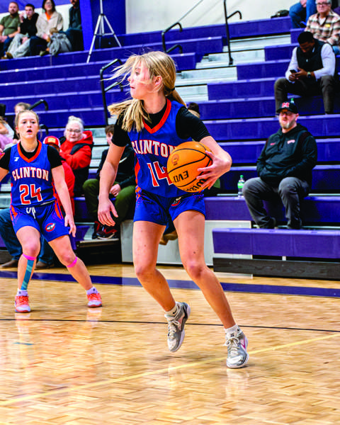 Clinton Middle School’s Caroline Jones advances the ball into Lady Hawks territory during a district tournament game against Maryville on Wednesday, Jan. 21. (photo:Tony Cox )