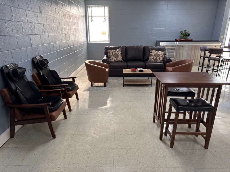 The Gary Terry Wellness Room, named for the school’s athletic director, includes tables, chairs, couches, massage chairs, a microwave, a coffeemaker and a refrigerator stocked with snacks.