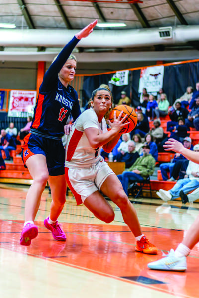 Clinton’s Addi Gamble drives through the lane for a contested shot against the Lady Jackets. Gamble had 22 points, eight rebounds, seven steals, six assists and four blocks, powering the Lady Dragons on both ends of the floor. (photo:Ellie Hatmaker )