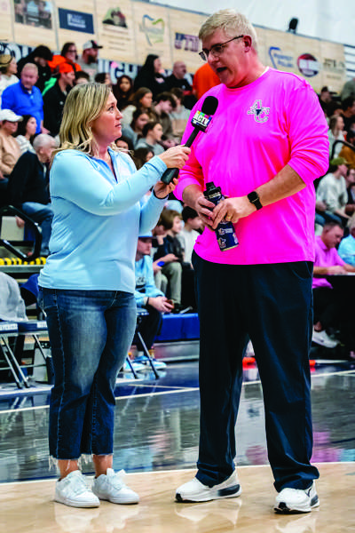 B.J. Caldwell inteviews Anderson County Lady Mavericks Coach Mitch Cupples for ACTV during a broadcast of the Anderson County vs. Clinton basketball game. (photo:Tony Cox )