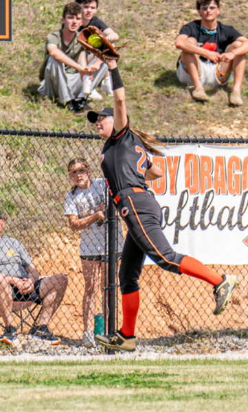 Clinton’s Maddisyn Reynolds leaps at the fence and secures a deep fly ball in center field during last week’s rivalry game against Anderson County. The Lady Dragons edged the Lady Mavericks 5-4. (photo:Tony Cox )