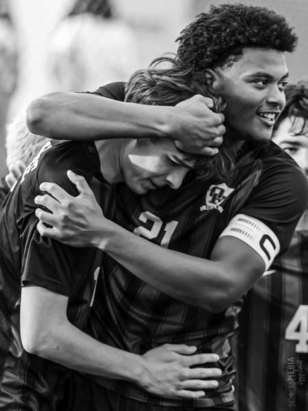 Daniel Jackson and Eli Pearson celebrate a goal scored by Pearson during the home game against Knoxville Halls. (photo:ORHS Sports Media )