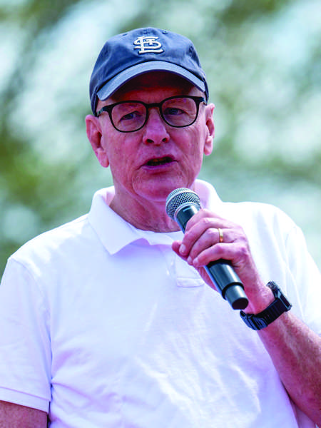 Former Oak Ridge High School track Coach Jim McNamee addresses attendees after being honored at the Oak Ridge Legends Invitational on Saturday. (photo:ORHS Sports Media )