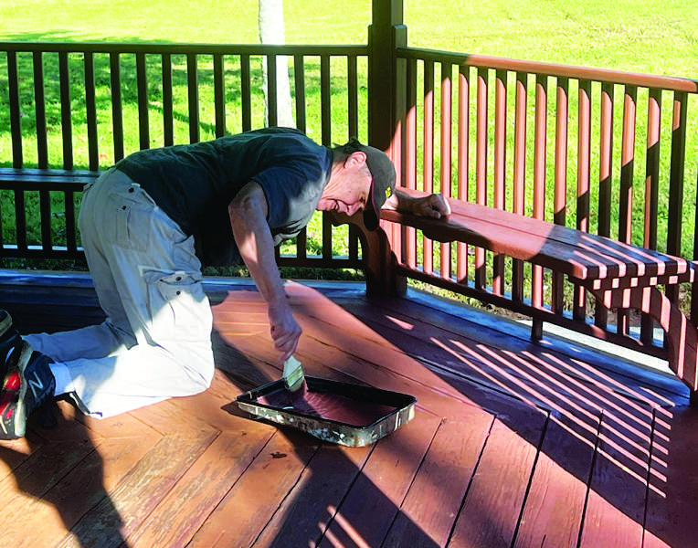 Mike Robinson works on staining the floor of the Norris gazebo during a Sunday morning work party at the downtown structure. - G. Chambers Williams III