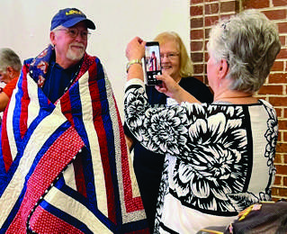 Pictured at September’s veterans breakfast are U.S. Navy veteran Buddy Martin, recipient of a Quilt of Valor, and Clinch River Quilts of Valor President Gwen Cole, taking his picture.