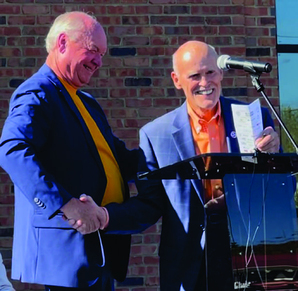 Anderson County Chamber President and CEO Rick Meredith, left, introduces Clinton auctioneer and Realtor Bear Stephenson at the speakers’ podium during last Friday’s dedication of the new Chamber headquarters building. Stephenson donated $1 million to the Chamber Foundation to help pay for the new facility. - G. Chambers Williams III