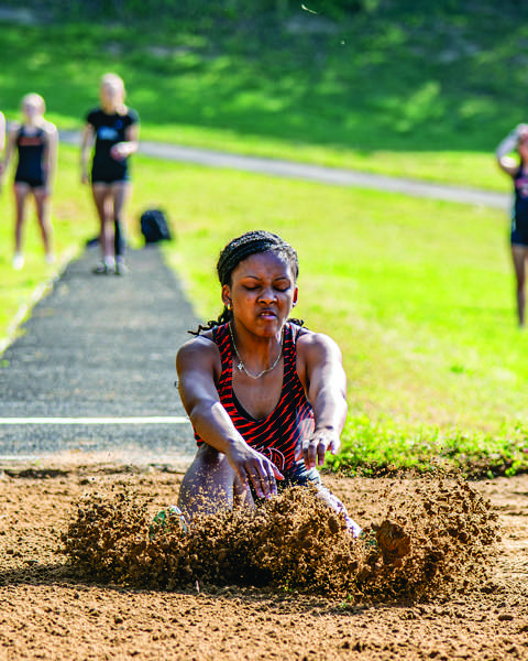 Clinton’s Maliyah Drake lands in the sand during the long jump at the South-Doyle Invitational on Saturday, April 11. Drake’s leap of 15 feet earned first place, topping the field by 1 foot, 3 inches. - Tony Cox