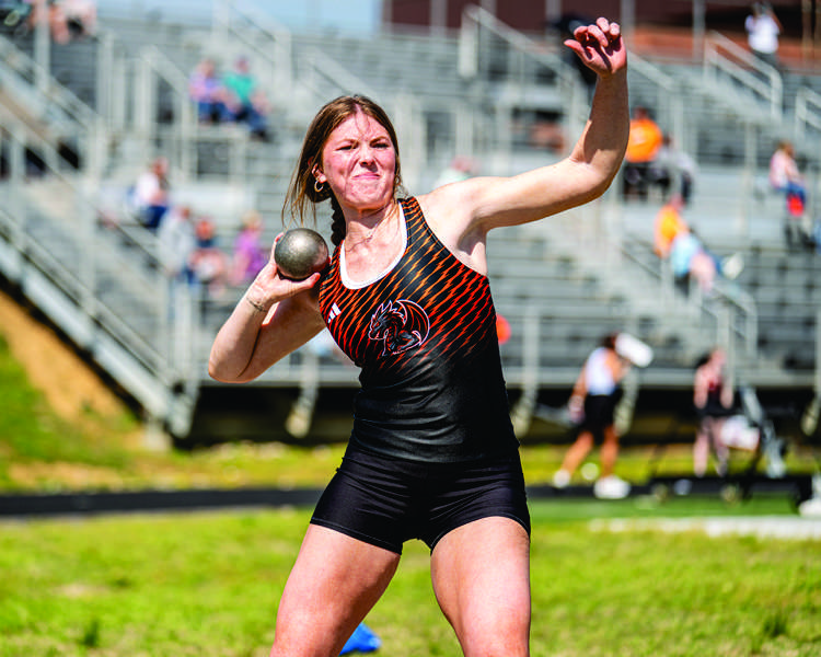 Clinton senior Kenzlee Hutchison powers through her shot put throw at the South-Doyle Invitational on Saturday, April 11. Hutchison set a school record with a toss of 34 feet, 3 inches, winning the event by 2 feet, 9½ inches. - Tony Cox