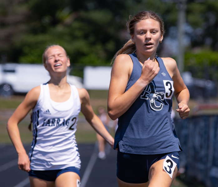 Anderson County’s Ava Moody pushes to the finish line in the girls’ 800-meter run at the Farragut Invitational on Saturday, April 11. Moody placed second in 2 minutes, 19.17 seconds. - Barry Houchen