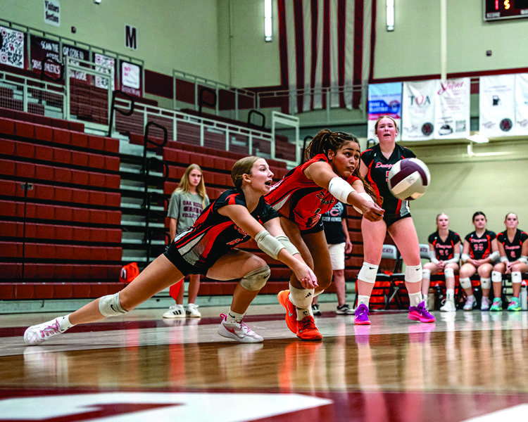 Clinton libero Jailie Rodd sprawls out for a clutch dig as defensive specialist Maggie Turbyville slides in for backup during the Lady Dragons’ five-set thriller against Oak Ridge. Clinton secured a 3-2 victory, keeping rallies alive with relentless defense. (photo:Tony Cox )