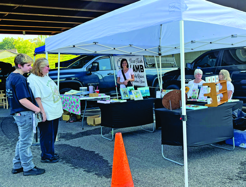 Visitors to the recent Clinton Farmers Market under the Green Bridge check out the lamb booth. Staffing the booth are, from left, Maria Garafolo, Katrina Weir-Kahn, and Linda Hanson. (photo:G. Chambers Williams III )