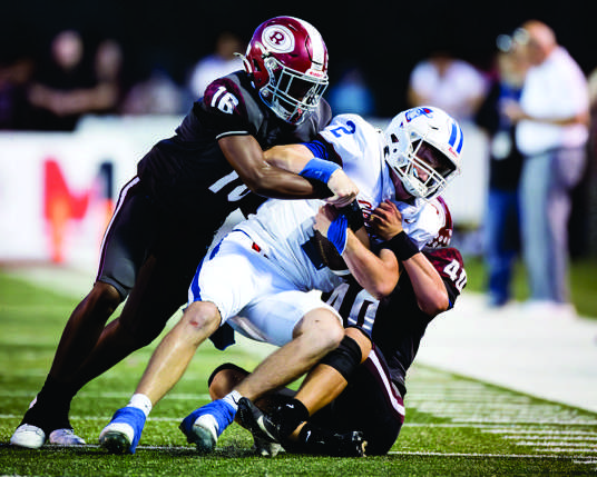 Oak Ridge defenders Zayden Williams (16) and Blake Woody (40) bring down Cleveland quarterback Kason McGowan during the Wildcats’ 35-7 region victory Friday night. (photo:Brennan Gleason | ORHS Sports Media )