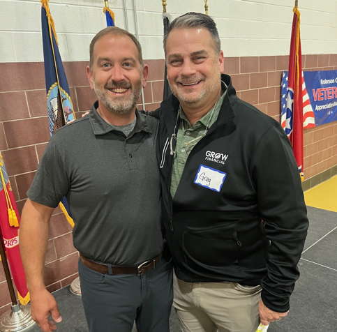 Pictured are U.S. Army veteran and helicopter pilot Greg McReynolds (right), who served as the master of ceremonies at November’s breakfast, and Jason Hamock, who donated his time and sound equipment to enhance the experience for the larger November crowd.