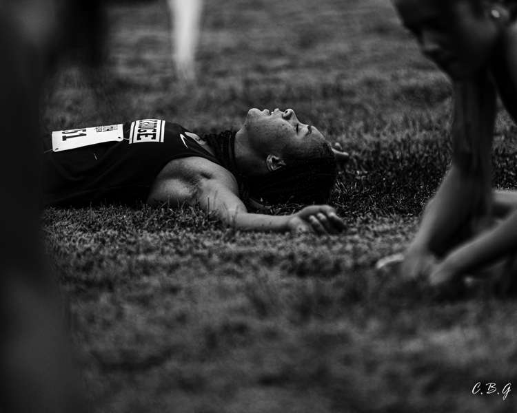 Runner Amaijah Bishop catches his breath on the grass after crossing the finish line, the toll of the race written in exhaustion and relief.