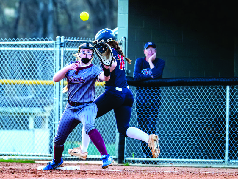 Taylor Hensley stretches for a throw at first base during an Oak Ridge softball game. - Allen Etheridge | ORHS Sports Media