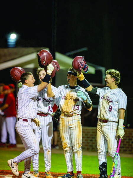 Jonah Wolfe, Jaiden Cheverton and Brooks Poteet react in the field after a Warren East hit during Oak Ridge’s game. - Allen Etheridge | ORHS Sports Media
