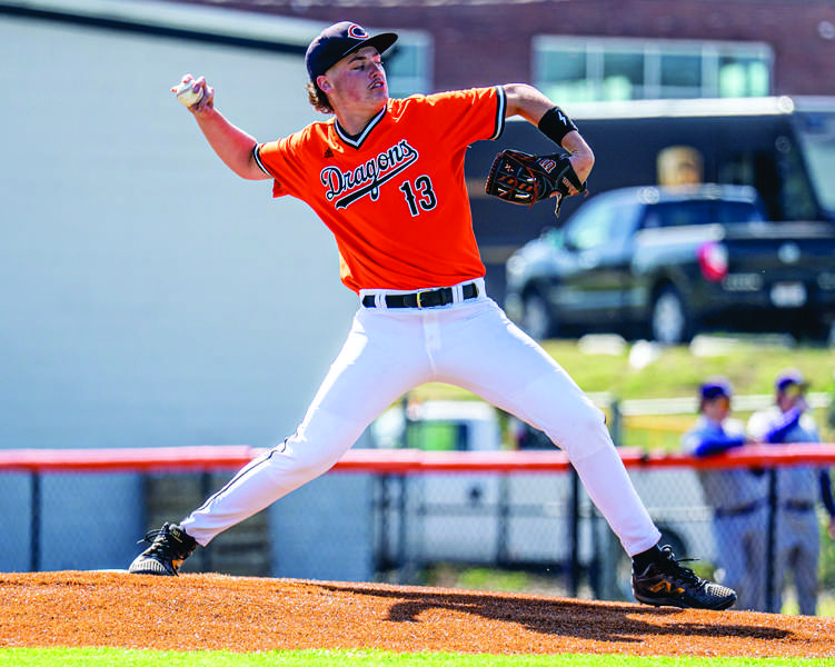 Clinton’s Will Brooks delivers a pitch during the Dragons’ game against Oliver Springs. Brooks turned in a complete-game effort, allowing one unearned run on six hits while striking out seven in seven innings against the Bobcats. - Tony Cox